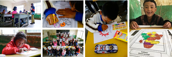 教室里,索尼音乐播放器中飘出的伴奏音乐中,孩子们涂色梵高经典画作。这样的美术课如同喧闹环境中的一股清流。志愿者们用这样的方式陶冶了孩子们的情操,培养着他们的美学意识。