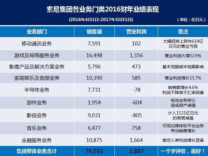 本财年营业利润同比减少55亿日元,为2887亿日元(25.78亿美元)。降低的主要原因是影视业务录入的9.62亿美元(1121亿日元)商誉减值。但由于移动通讯业务经营业绩的改善及游戏及网络服务业务部门营业利润的增加,影响被大幅抵消。