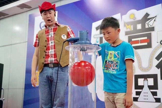 当日下午,索尼探梦科技馆又带来了互动性很强的“探梦实验室”科普秀,现场的孩子们热情高涨、踊跃报名加入实验,在玩乐中体验科学的神奇。“探梦”的实验人员仿佛插上了想象力的翅膀,以生活中简单易得的素材,巧妙地融合知识和趣味,进行了丰富多彩的实验表演,例如用几张小纸片就能做成神奇的“飞去来器”、徒手让沉甸甸的保龄球在空中“飘浮”、“氦气变声”、“空气炮”等,孩子们在潜移默化中掌握科学知识,产生了对科学的浓厚兴趣。