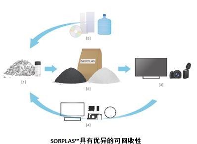 SORPLAS™的诞生要追溯到十多年前。那时研究人员的主要课题集中在如何更有效地利用索尼工厂产生的废旧塑料。经调查研究,研究人员研发出可使聚碳酸酯高聚物具有很强耐火性的全新硫磺阻燃剂。通过将这种阻燃剂添加入来源于索尼工厂的废弃光盘和胶片的聚碳酸酯塑料中,具有优秀性能及环保可持续性的再生塑料SORPLAS™得以问世。