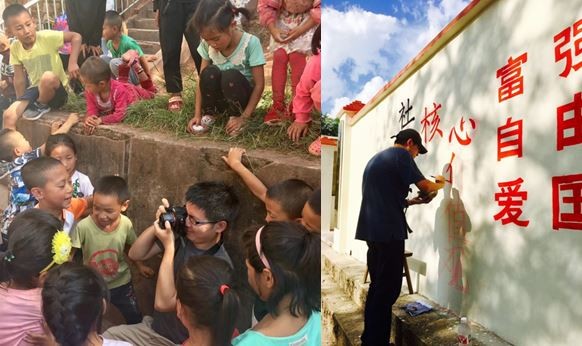 参与记录支教活动时,被孩子包围的索尼粉丝志愿者和正在帮忙绘制板书的粉丝志愿者。