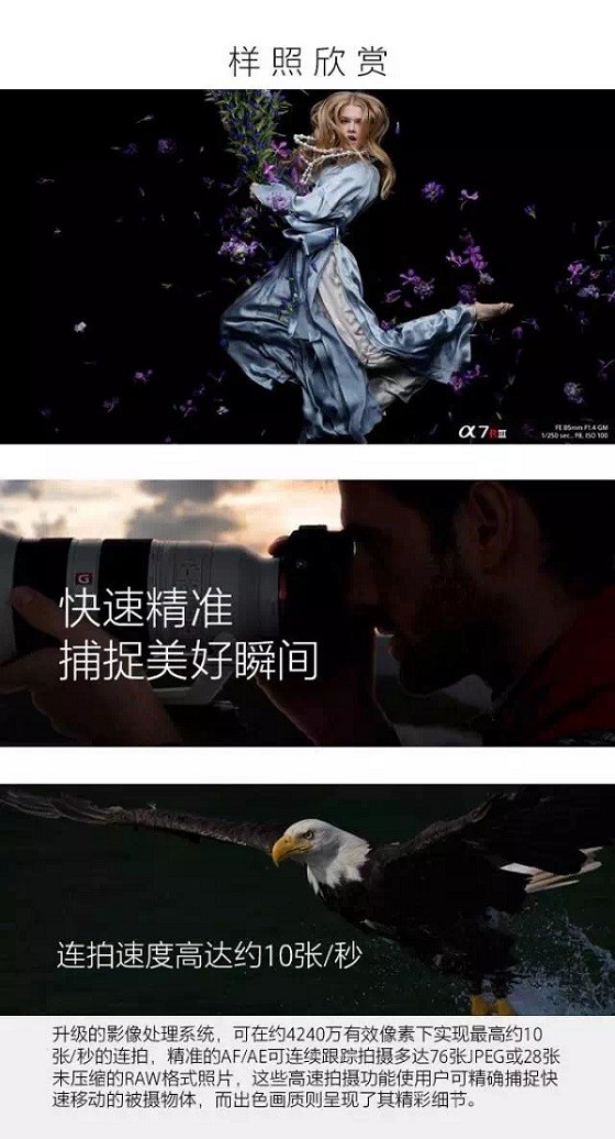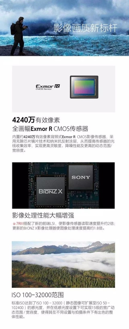 同过去的A7R系列一样,本次发布新品最大的亮点在于,由BIONZX处理器驱动的4240万有效像素背照式Exmor R CMOS影像传感器。如此一来,意味着A7R III拍摄的照片分辨率将会是A9的两倍。不过,由于A9所配备的全画幅堆栈式影像传感技术,它在拍摄速度上仍然占有优势。但是,A7R III并不是个“慢家伙”,它的自动聚焦速度是A7R II的两倍。上一代A7R只能以最高5张/秒的速度拍摄, A7R III则能在AF/AE追踪模式下,以最高10张/秒的速度连续拍摄。
