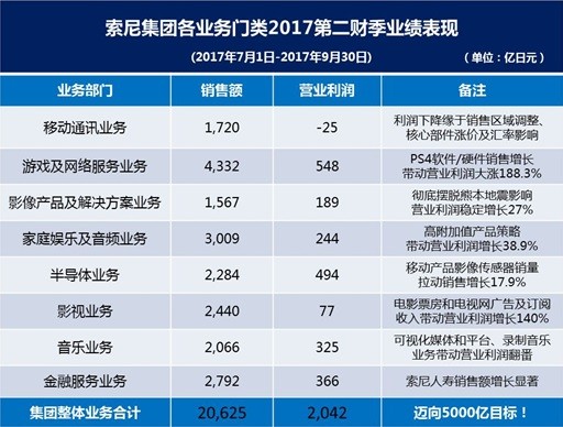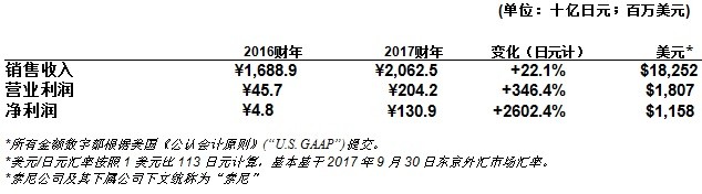 2017财年第二季度(截止2017年9月30日),索尼公司销售收入与上年同比上升22.1%,为20,625亿日元(182.52亿美元)。销售收入增长的主要原因是:游戏和网络服务业务增长及有利的外汇因素。营业利润方面,与上年同期相比增加了1,585亿日元,达到了2,042亿日元(18.07亿美元)。营业利润同比大涨的主要原因是:半导体业务及游戏和网络服务业务的利润改善。