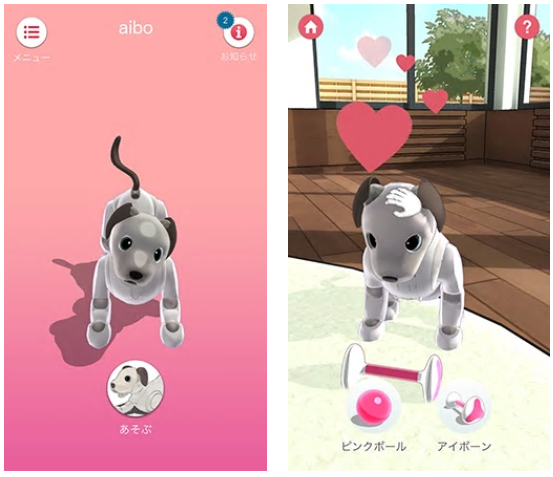 用户能够与画面上显示的aibo一起玩耍。轻碰aibo、轻击粉球或骨头,可以与它交流互动。