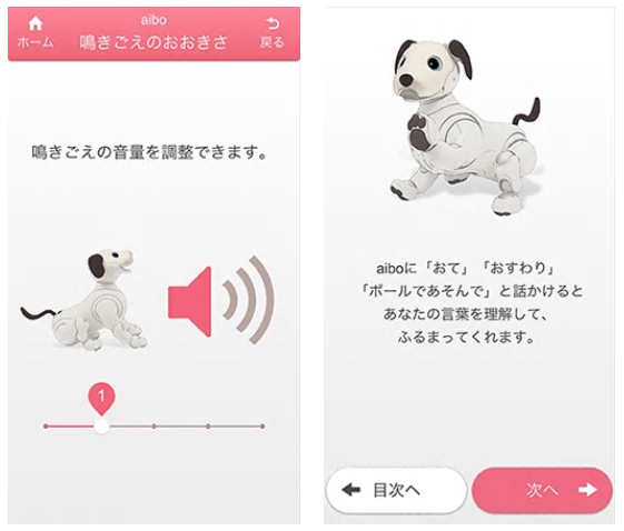 用户可通过APP设置aibo的名字和音量,确认其性格和当时的状态(通讯状态、电池余量)。如拥有两台及以上aibo,用户可自由切换进行管理。并且,还能通过基本操作的学习指南,找到与aibo亲密相处的诀窍。