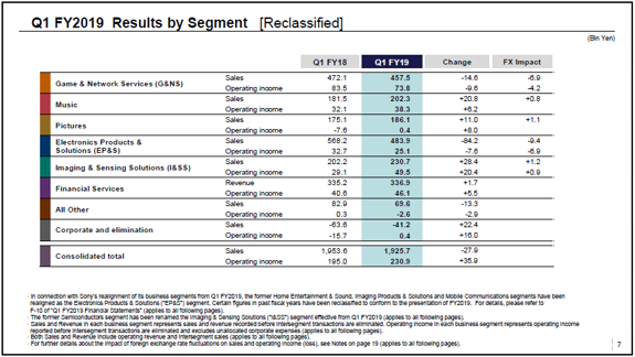 (东京,2019年7月30日 )-- 索尼公司(下称索尼)今日公布2019财年第一季度(2019年4月1日-2019年6月30日)整体业绩数字,如下: