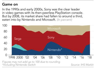 如果视频游戏仍是消费电子产品界的先锋,那么索尼将处于强势之位。PlayStation 4自2013年发布以来大受欢迎,累计销量超过1亿台,是微软Xbox的两倍多;索尼游戏中仅《漫威蜘蛛侠》就售出了1300万张。虽然任天堂的Switch受到了休闲玩家的喜爱,但硬核游戏爱好者仍是索尼的拥趸。