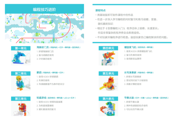 本次新推出的相关课程,相比原有课程更是增添了更多有趣好玩的内容,让孩子在学习进阶课程中快乐成长。据悉,这两个课程都分别推出了6个单元,18个任务。其中《机器人构造进阶》中的每个单元各有一个作品示例,本次在开放的单元中新增了“爬树的考拉”、“骑摩托车的兔子”等示例。让人惊喜的是,这次课程中还会有作品的实际制作与编程,用户通过课程,还可以学习实现小作品动作中需要的机械原理与编程方法,既能获得乐趣,又获得了知识。而《编程技巧进阶》中学员可以通过“海豚射门员”、“转盘游戏”等互动小游戏的制作以及较复杂程序的编写,学习如何高效得编程以及复杂算法的实现。