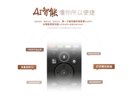 在智能领域,索尼U8G具备AI智能语音功能,带来更快、更智能的交互体验。诸如搜索、音量调节、询问天气、APP操控等,都能通过索尼电视的遥控器一键完成。
