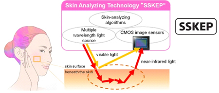 一般而言,皮肤分析技术的一个重要方面是同时具备检测可见光容易达到的表层皮肤,以及只能通过近红外光达到的皮肤下层的能力。“SSKEP”可以同时优化控制多个波长的光源输出,及通过CMOS影像传感器实现的影像捕获处理过程,以实现皮肤表面上下方的高灵敏度摄影,从而使多样化和高度精确的皮肤分析成为可能。