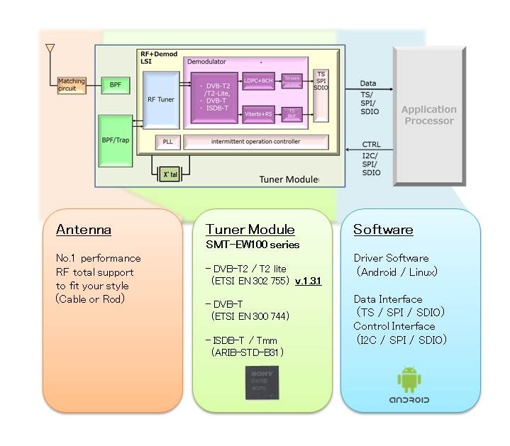 此调谐器模组可支持众多制式的数字地面电视广播系统,包括DVB-T,DVB-T2,DVB-T2 Lite,ISDB-T和 ISDB-Tmm。在SMT-EW100系列调谐器模组供货同时,索尼还将提供天线、软件和技术支持。在该整体解决方案的支持下,移动设备制造商可便捷地将DTV(数字电视)功能加入其产品中。SMT-EW100预计于2015年5月开始供货。