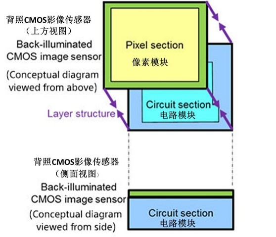 新开发的加入了DRAM层的3层堆叠式CMOS影像传感器(上图)