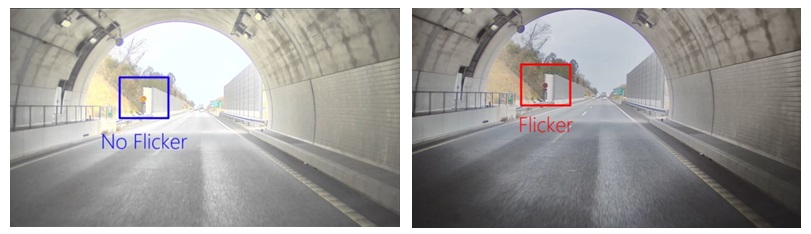 在现今的交通环境中,交通标识、信号以及汽车头灯和尾灯通常使用LED灯。这意味着车载摄像头必须能够准确地捕获这些元素。然而,由于LED灯会快速地重复闪烁,且这种闪烁人眼察觉不到,当被摄像头捕捉时,会产生LED频闪现象。用普通CMOS影像传感器捕获的LED光源常常会出现频闪,这会妨碍对信号和周围汽车的准确识别。索尼的新影像传感器通过使用长于LED闪烁频率的曝光时间解决了这个问题,从而最大限度地减少了频闪的可能性。
