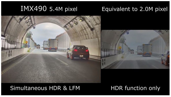 即使在隧道出入口这样明暗对比强烈的环境下,车载摄像头也需要以低噪点捕捉清晰的图像,并避免拖影和高亮过饱和等问题。得益于索尼独有的像素结构和改良后的曝光方法,该传感器的HDR拍摄在保证低噪点的同时可达到120dB※3的动态范围,约为前代产品的3倍。该传感器甚至可以在10万勒克斯(相当于太阳直射的照度)环境下拍摄时,避免高亮过饱和。