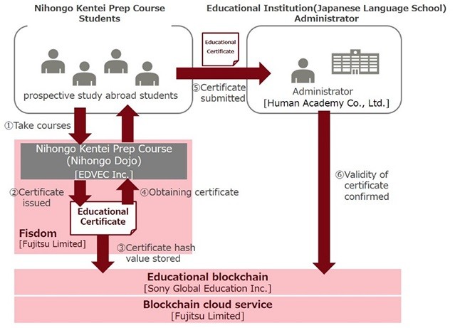 为了解决这些问题,索尼国际教育、富士通和富士通研究院将开始进行多阶段的测试,首先是参加Nihongo Dojo课程的预申请交换生,为其参加Nihongo Kentei考试做好准备。Nihongo Dojo课程是在富士通的数字学习平台Fisdom上开发的,在新的测试中,学生的课程数据将通过区块链进行管理,修曼日本语学校以此检验他们的学习资质。