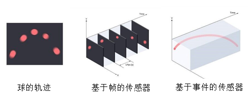 基于帧的传感器根据帧率以固定的间隔输出整个图像,而基于事件的传感器则使用行选仲裁器电路*3异步选择像素数据。通过将1μs精度的时间信息添加到亮度发生变化的像素地址,可以确保高时间分辨率的事件数据读出。此外,通过有效压缩事件数据,即每个事件的亮度变化极性、时间和x/y坐标信息,已经实现了1.066Geps*4的高输出事件率。