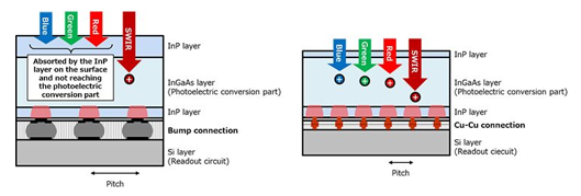 *1:构成受光型光电二极管的InGaAs层与构成读出电路的硅层通过铜-铜连接相连。这使得磷化铟(InP)层更薄,可见光得以穿透。